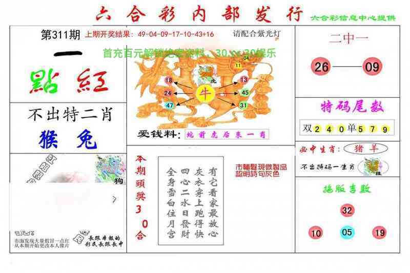 | 311期:天地+二肖〖地肖+猴兔〗开:蛇37准 |